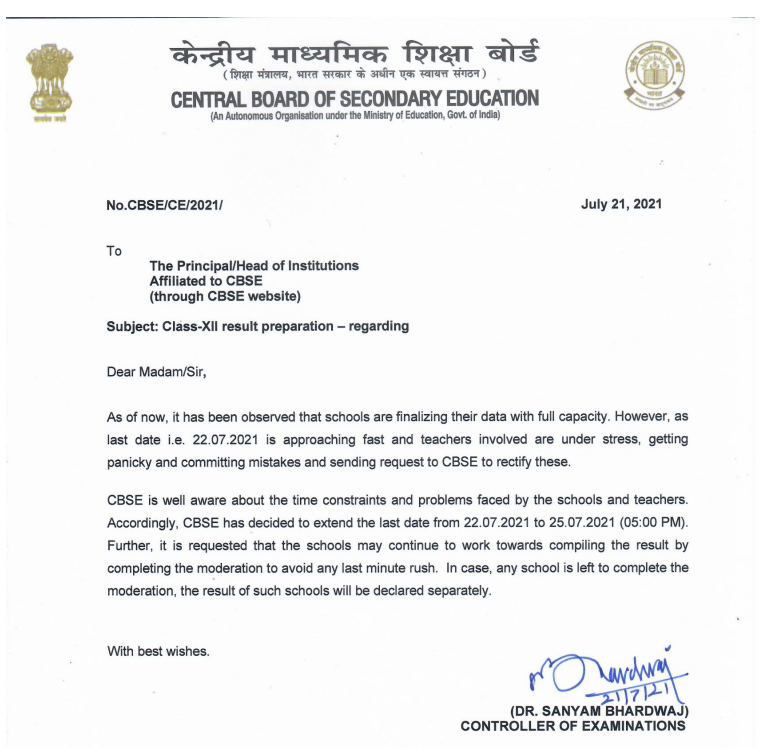 CBSE Class 12 result 2021 The Central Board of Secondary Education has given a big relief on Wednesday, 21 July 2021. The board has extended the last date to finalize the 12th class result. According to this, now the result of the school class 12 result will have to be finalized by July 25.